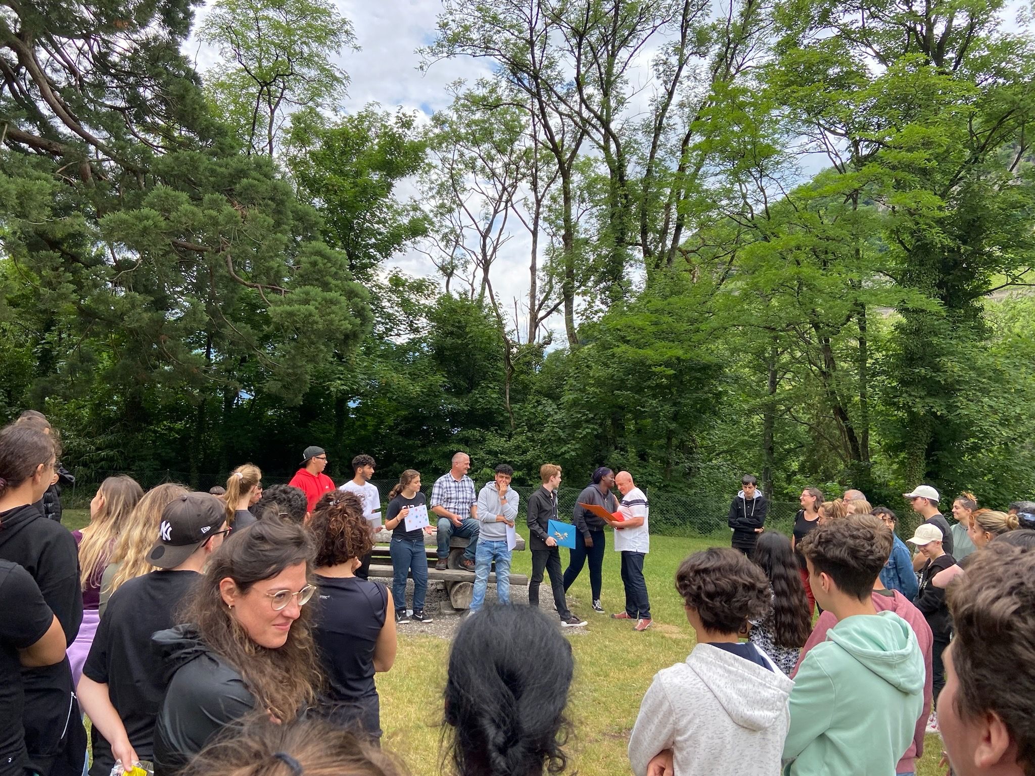 Le rendez-vous était fixé à 9h00 au Parc Saint-Pierre, point de départ de cette aventure. Chaque équipe a reçu une enveloppe contenant les dossards, une carte du parcours et un carton de pointage pour valider les activités. Après un mot d’explication donné par Caroline, la course a été lancée dans la bonne humeur. Les équipes se sont rapidement dispersées dans la ville d’Aigle, à la recherche des postes répartis sur le terrain. Vers midi, un orage soudain a interrompu les activités. Chacun a trouvé refuge comme il a pu, et nous en avons profité pour faire une pause repas bien méritée. Une fois la pluie calmée, les participants ont pu reprendre le parcours. Une journée sportive et conviviale ! Lundi 23 juin 2025, les classes de TEM Est ont participé à une grande course d’orientation organisée dans le cadre d’un projet de fin d’année Pop-Up. Cinq classes étaient représentées : Jura 8, Hébergement, Face Nord, Moulins 15 et Rhône 5.