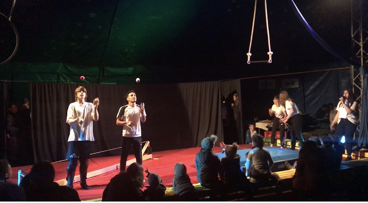 D’autres numéros de trapèze, clowns ont suivi. Puis, les jeunes des classes de Moulins 15 et 24, sont entrés en piste. Accompagnés de la voix entraînante d’Abir, Elodie, Sara et Atila ont présenté un numéro de trapèze et de souplesse: impressionnant! Fitsum et Florian ont épaté le public en jonglant avec leurs balles. De leurs mains de fées, Albina et Maria ont tourné les assiettes, qui n’étaient pas en verre… Isaac, Michaël et Atila ont traversé périlleusement la scène sur un fil accompagné de Killian, haut perché sur ses échasses. La jolie compagnie a fini par saluer le public sous la forme d’une jolie pyramide. Bravo à eux! S’ensuit un numéro impressionnant de monocycle.