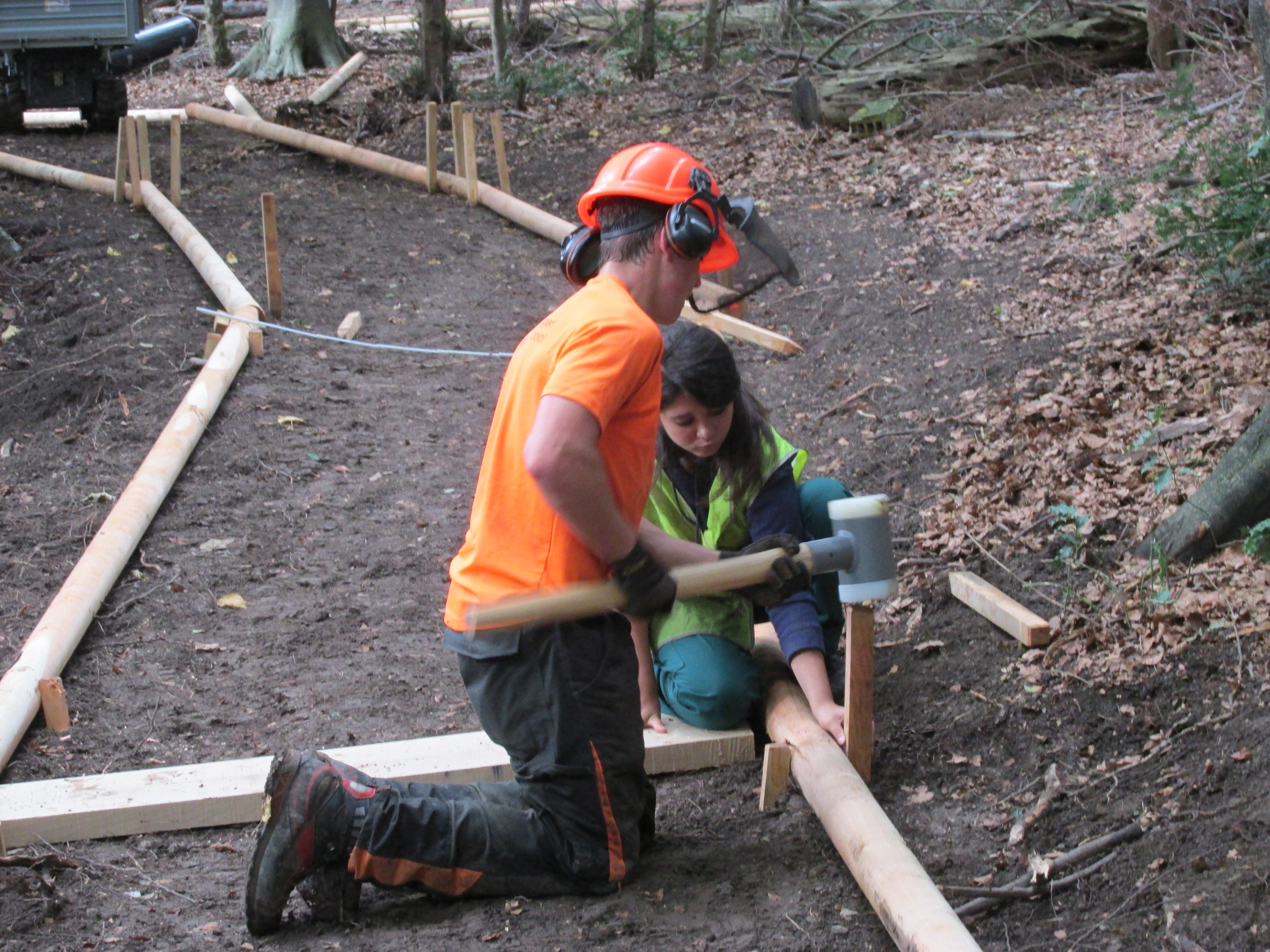 Après avoir déterminé la largeur du sentier, on a mis des perches en mélèze.
