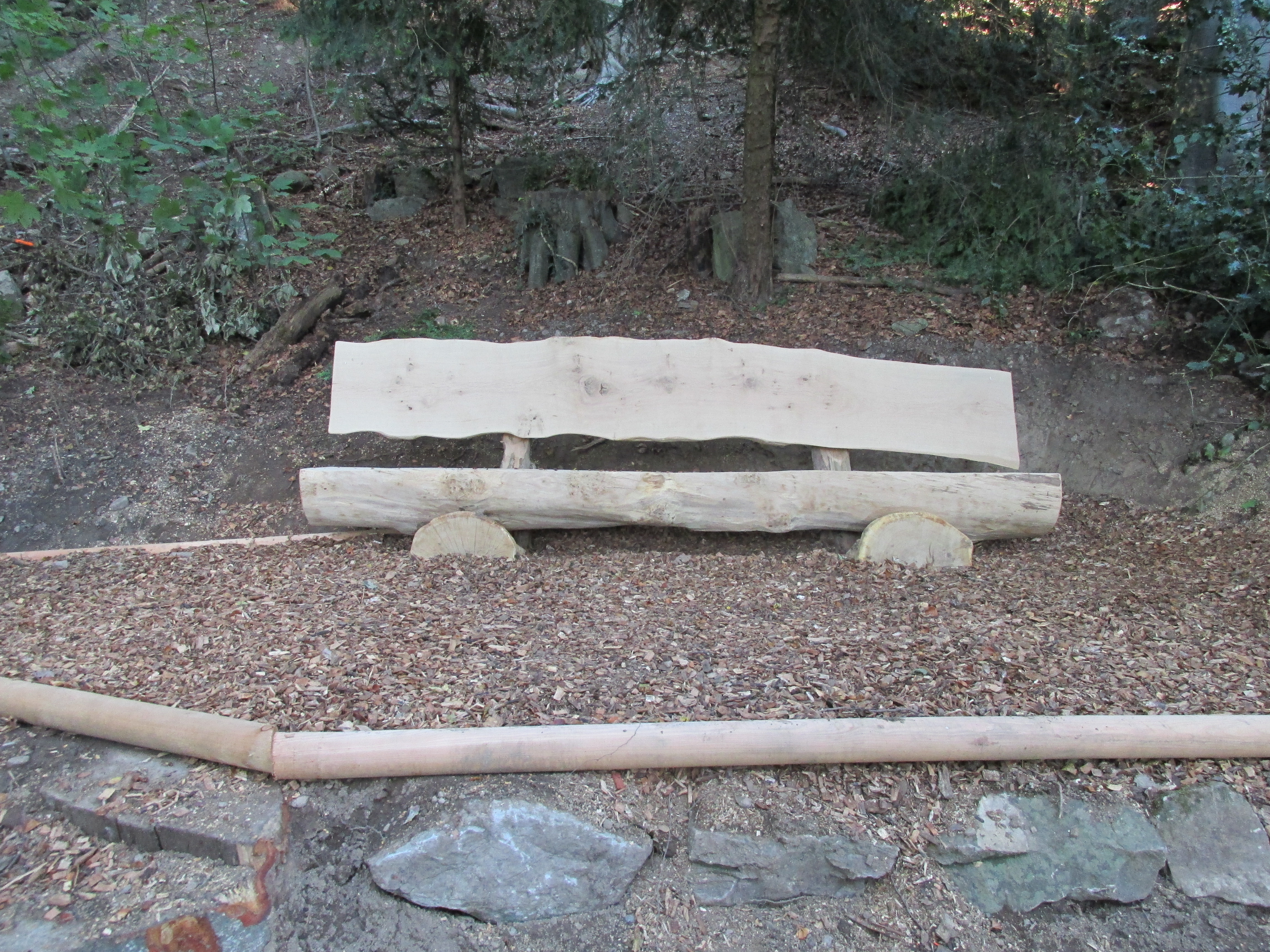 Cet apprenti est en train de construire un banc. Il coupe en deux les troncs. Le petit pour les pieds, le grand pour l’appui dos et pour s’asseoir.