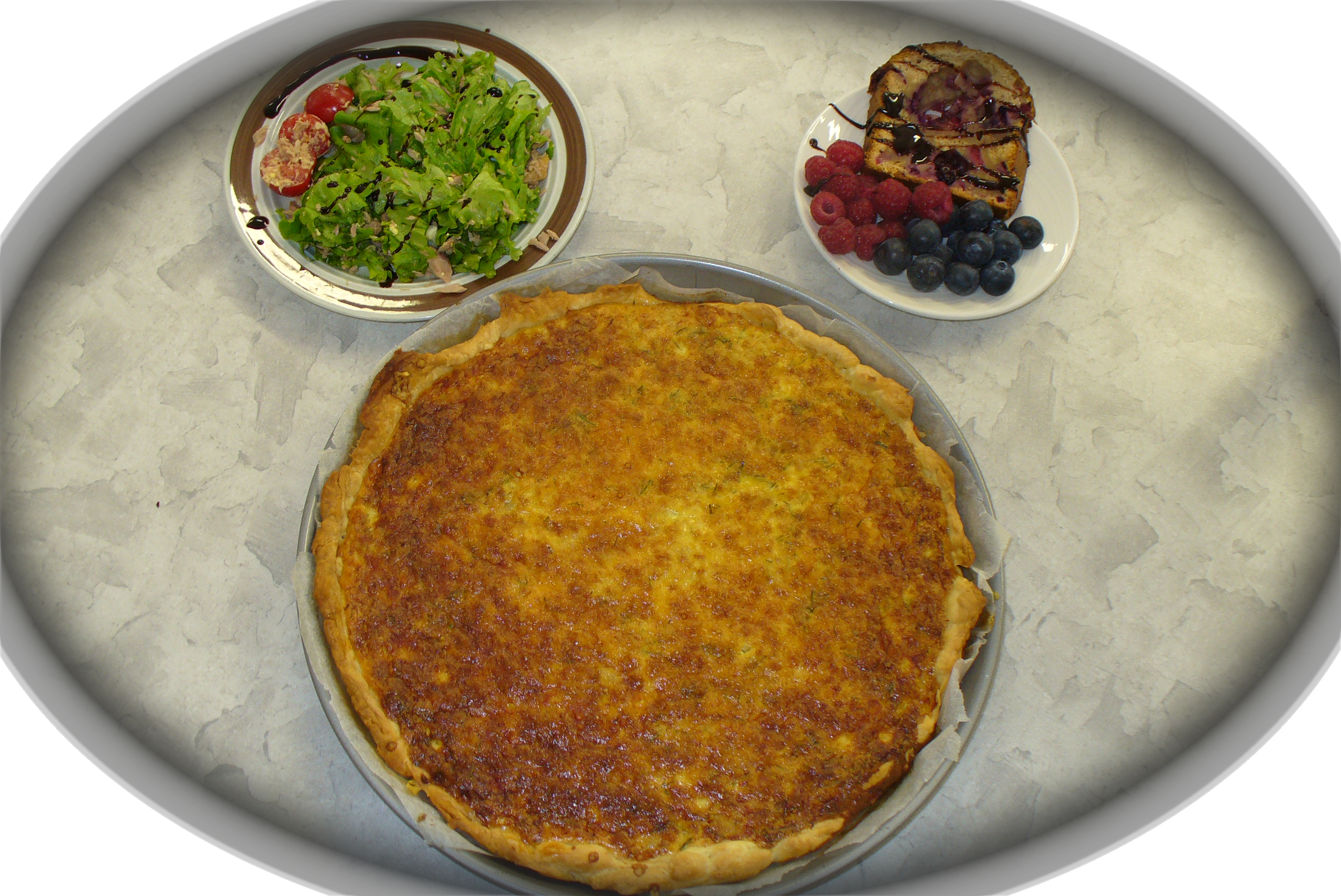 une quiche au thon avec une salade César suivi d’un cake framboise, myrtille
