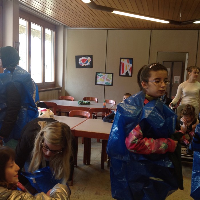 Lara se prépare à la salle à manger avec les autres élèves et les adultes qui les accompagnent.