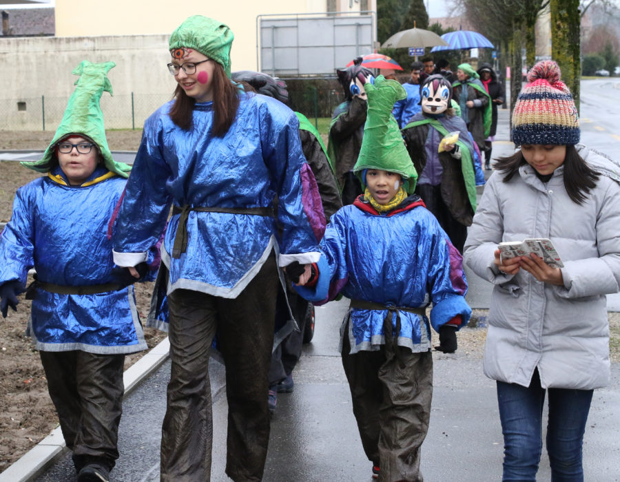 Tout le monde était là pour nous voir. Quand c’était fini on est allés en salle de fête pour faire le goûter. Ensuite nos parents sont venus nous chercher. On a lancé des confettis, on a dansé. Plus tard on est rentrés à la maison. Il y avait des guggenmusiks, il y avait des chars, comme le palais des chats. On a mélangé des costumes.