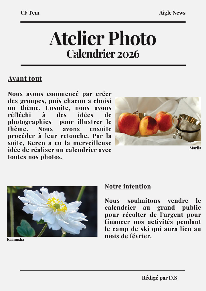Au cours de l’année, l’atelier photo du CF TEM Aigle s’est consacré à un projet créatif d’envergure : la réalisation d’un calendrier 2026 entièrement illustré par les élèves. Répartis en petits groupes, ils ont sélectionné des thèmes qui les inspiraient, puis ont imaginé des mises en scène originales pour donner vie à leurs idées.