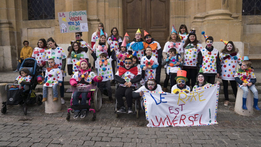 C’est sous la banderole LE RIRE EST UNIVERSEL que quarante élèves, grands et petits, ont pris part au cortège, maquillés et déguisés en clowns du monde, avec des ronds de couleurs rappelant le logo de la Fondation.
