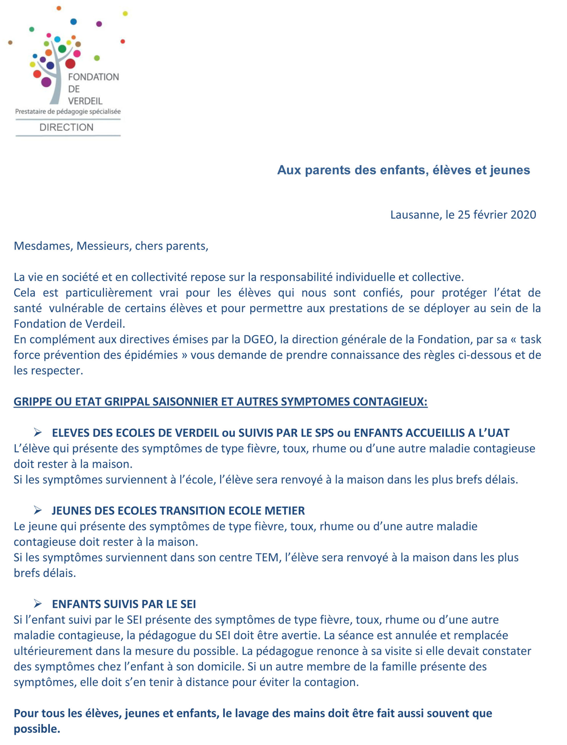 Coronavirus : lettre à tous les parents des enfants, élèves et jeunes de la Fondation