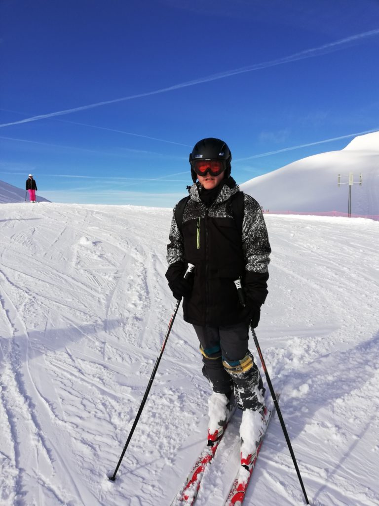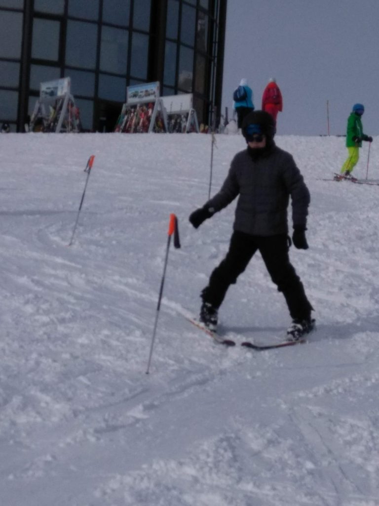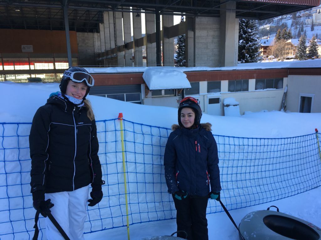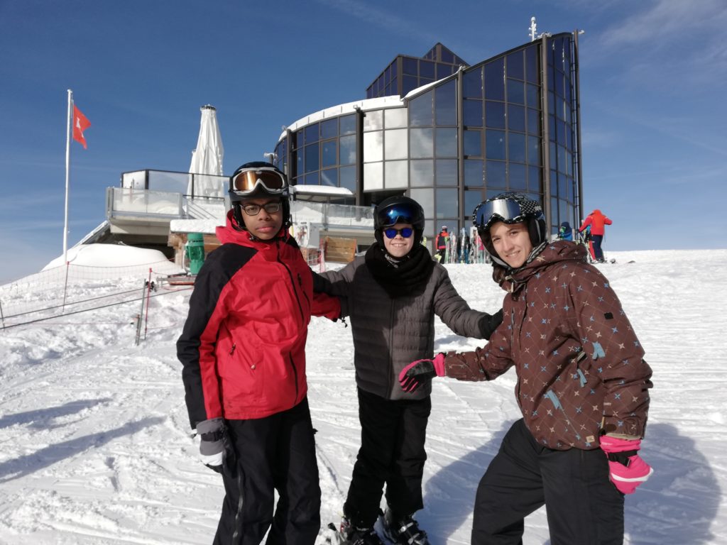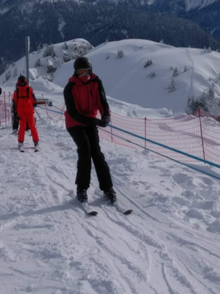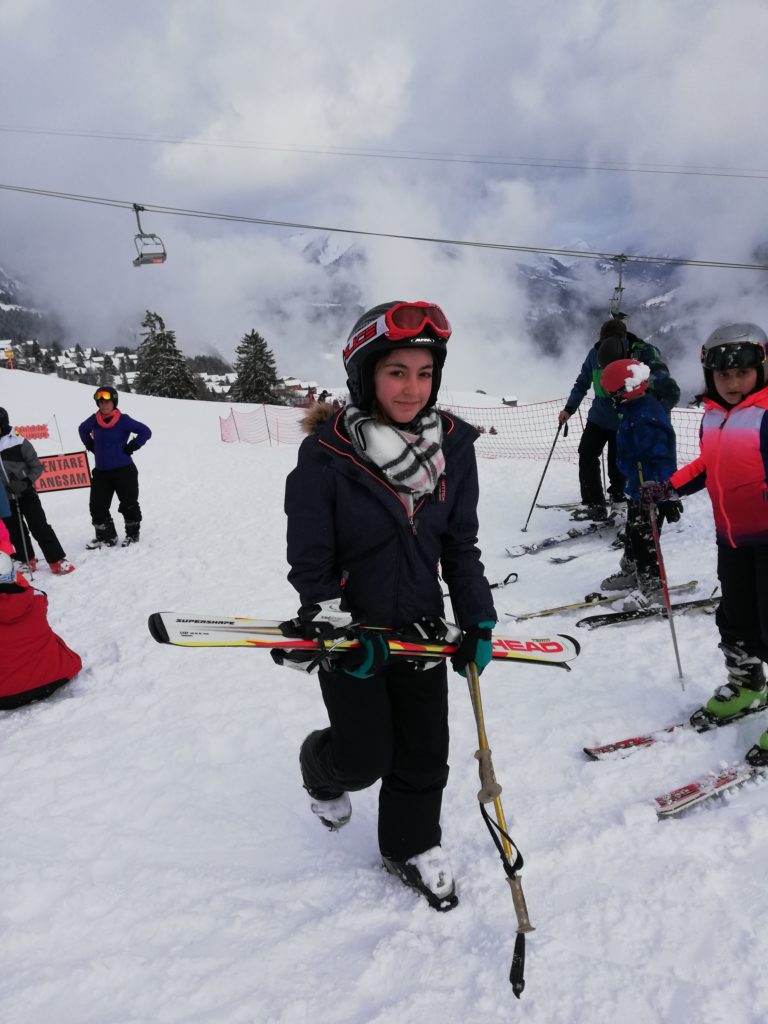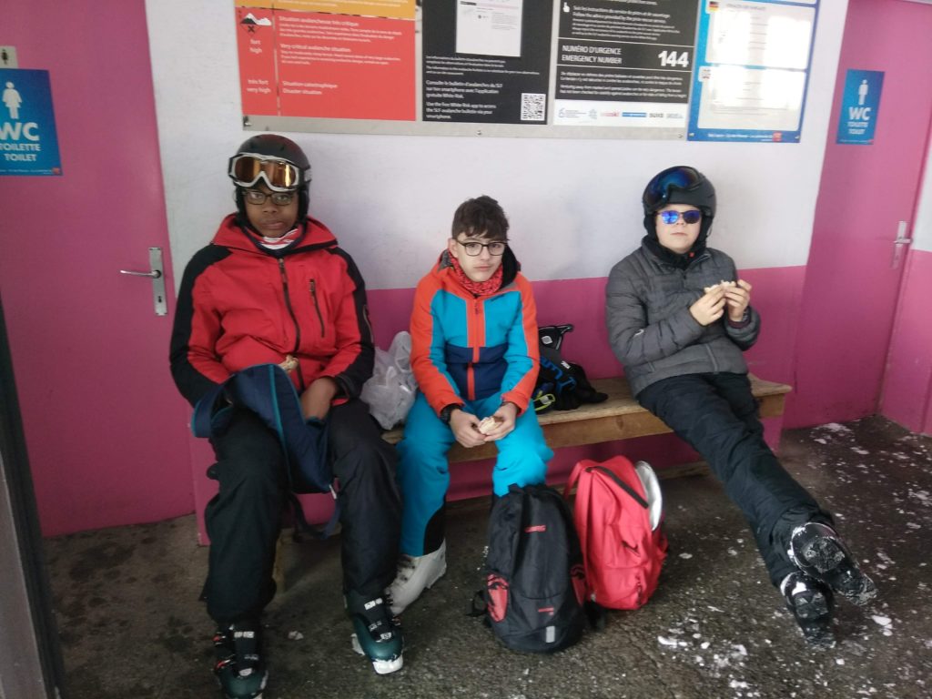 Saori, Vanessa, Alexis et Mikaël skient avec M. Pellaux sur les pistes bleues et rouges pendant que Adrien, Bruno et Exaucé apprennent à skier avec Sophie et Anne-Sophie. Nous montons tous au télécabine. Là haut, il y a une petite remontée mécanique qui nous tire grâce à une corde. Ce n’est pas très facile de rester stable ! Les trois élèves écoutent les conseils de Sophie et peu à peu, la glisse est un peu plus facile avec l’aide de l’adulte.