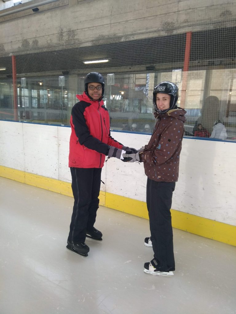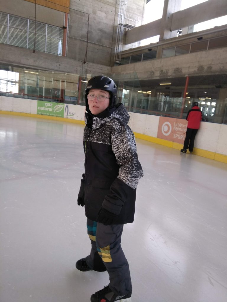L’équipe des 4 redescend à ski avec M. Pellaux tandis que les autres descendent avec le télécabine. Comme il fait beau, nous pique niquons dehors à côté de la patinoire, puisque nous l’avons réservée pour 13h30. Nous irons ensuite à la piscine.