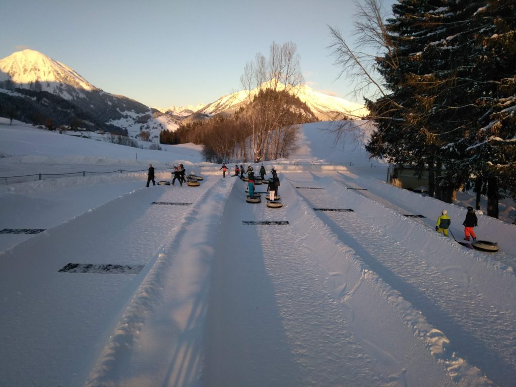 Nous nous retrouvons à midi pour pique niquer dans la salle d’activités pour être au chaud. Nous prenons un peu de repos dans la chambre et nous allons au « tobboganning ». Il y a déjà beaucoup de monde, heureusement que nous avions réservés !!