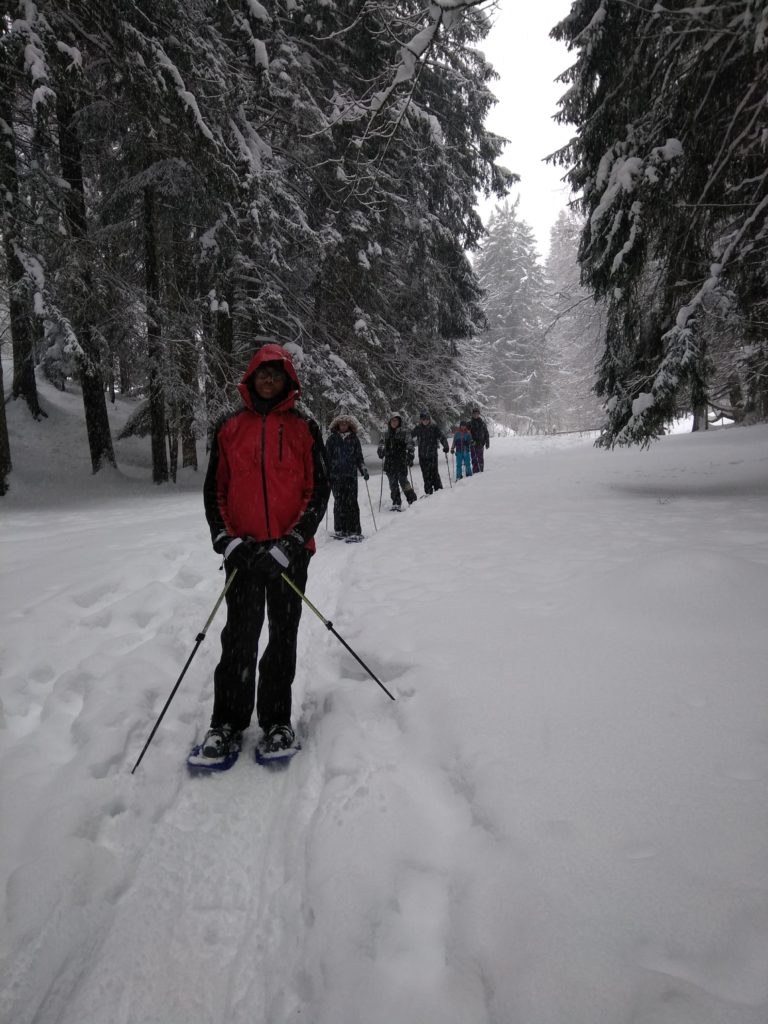 Le dernier jour du camp est déjà là ! Nous avions décidé de faire des raquettes, car la météo n’est pas très favorable à la pratique du ski, tellement, il neige. Il faut déjà charger le bus et déblayer la neige pour pouvoir le sortir !